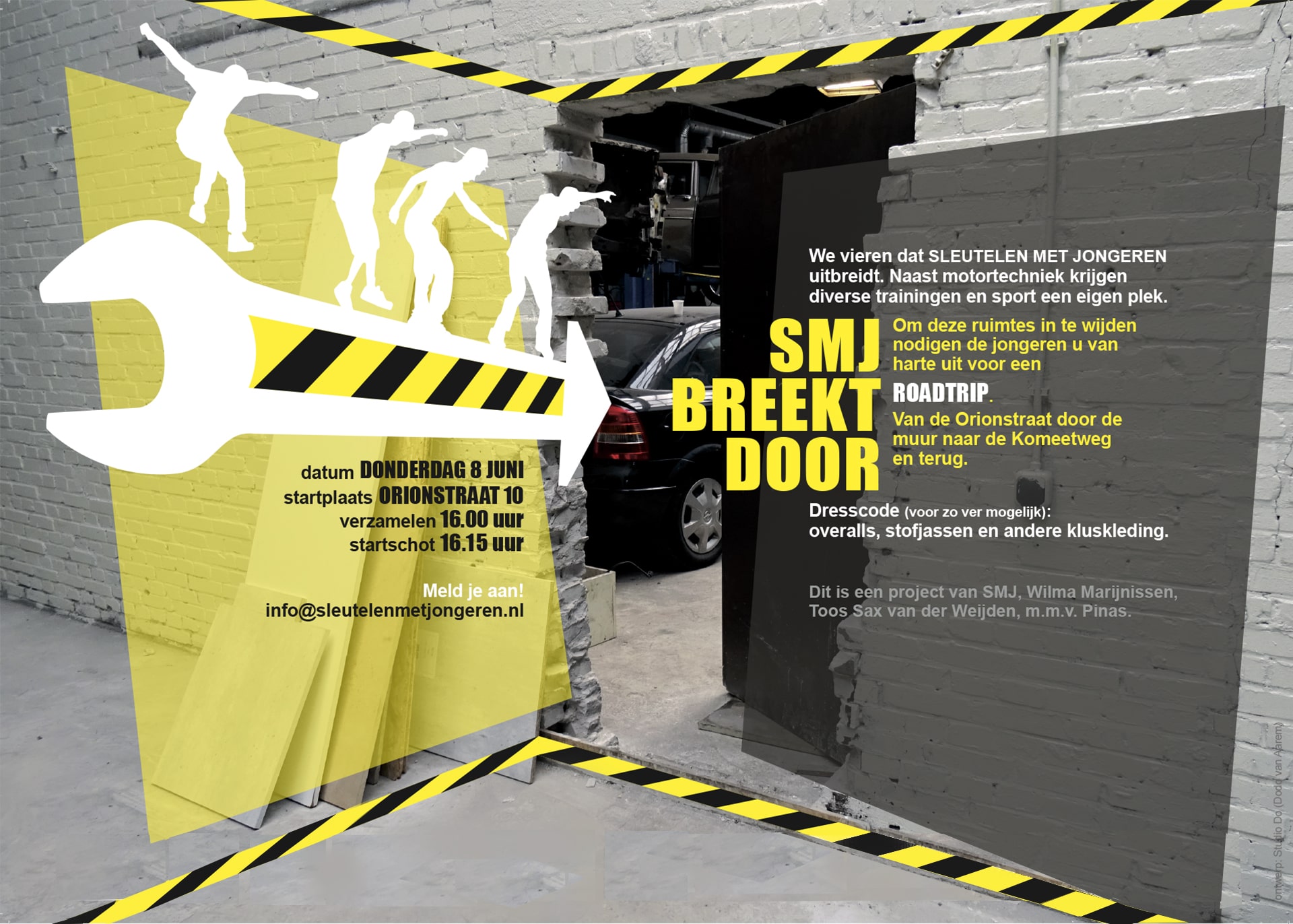 Affiche voor de opening van de nieuwe werkruimte van Sleutelen Met Jongeren in opdracht van Wilma Marijnissen