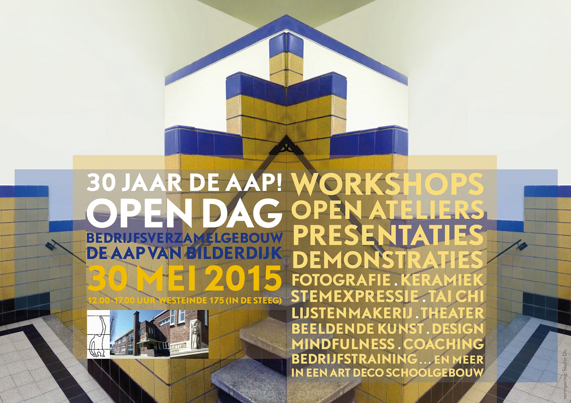 De bedrijvenvereniging De Aap van Bilderdijk is gevestigd in een voormalige school dat geheel in de Nederlandse Art-deco-stijl werd ontworpen. Het karakteristieke trappenhuis in de centrale hal is gebruikt als uitgangspunt voor dit grafische ontwerp.