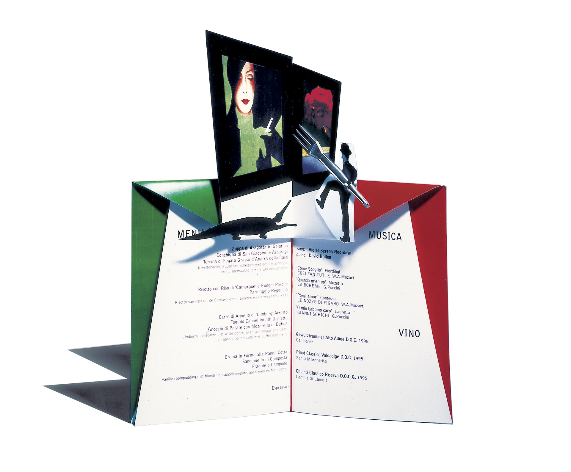 Uitgangspunt voor deze gevouwen menukaart is de speelse huisstijl van de Internationale Affiche Galerij, aangevuld met afbeeldingen van tentoongestelde affiches en een zilveren vorkje.