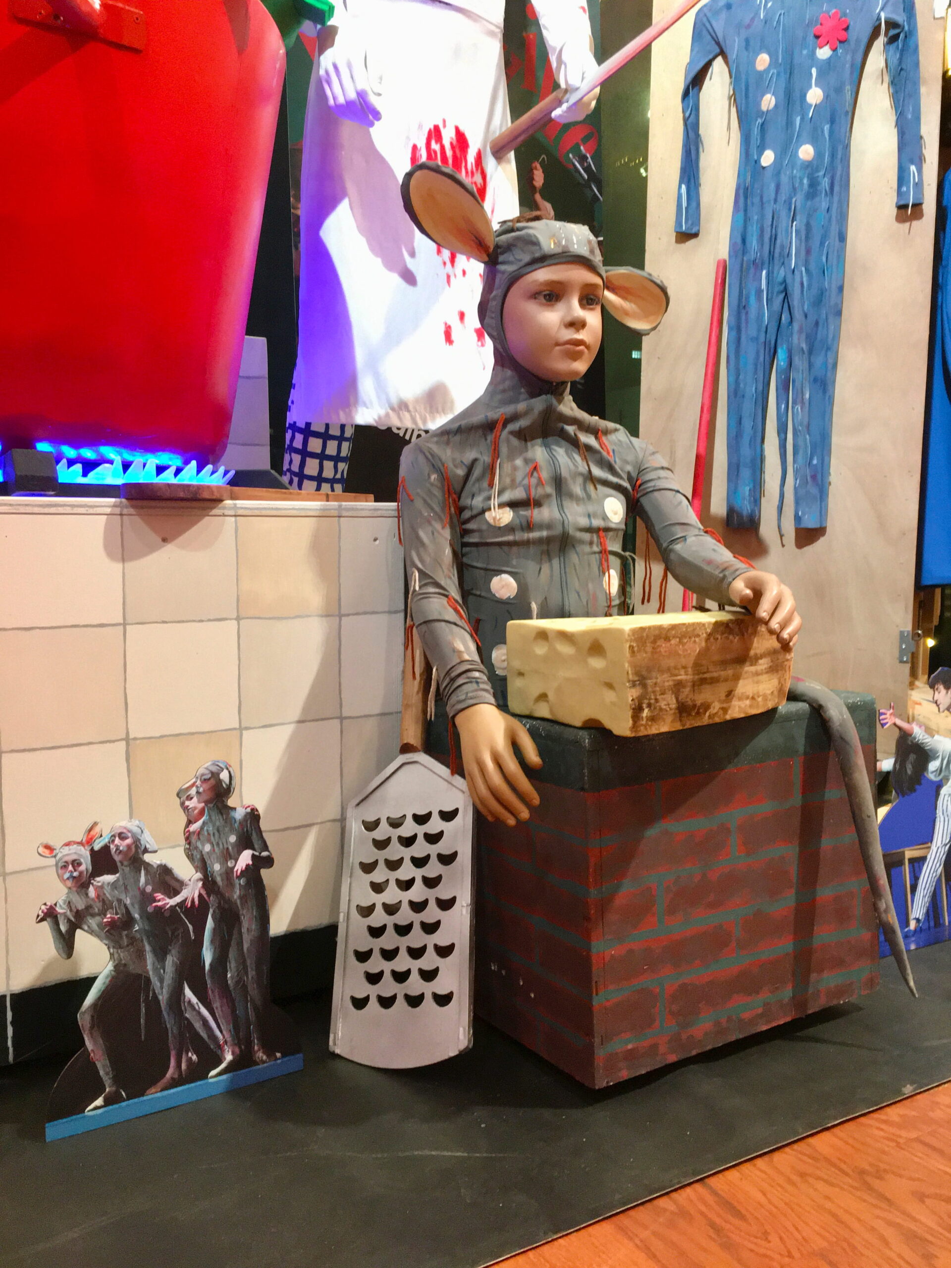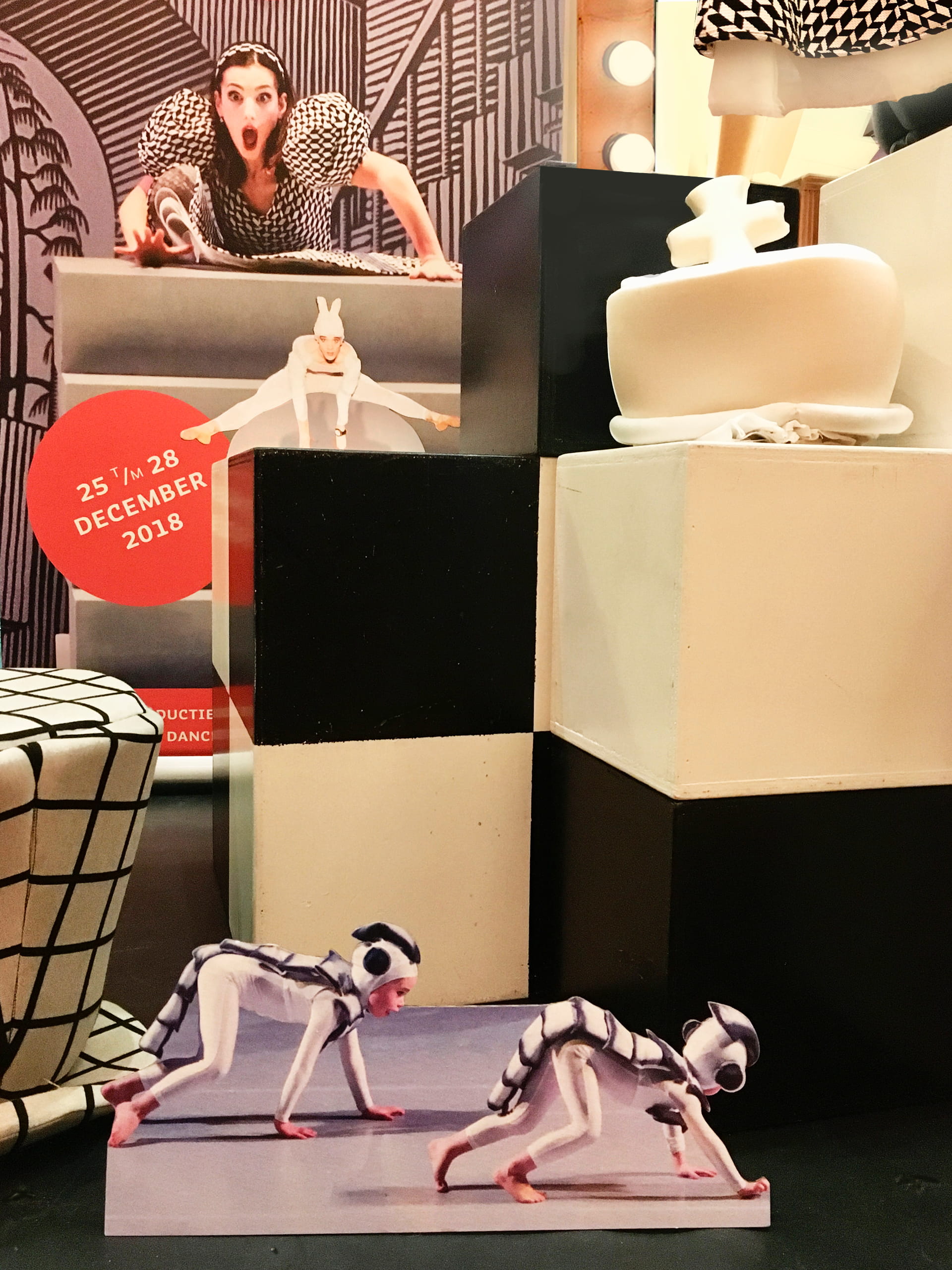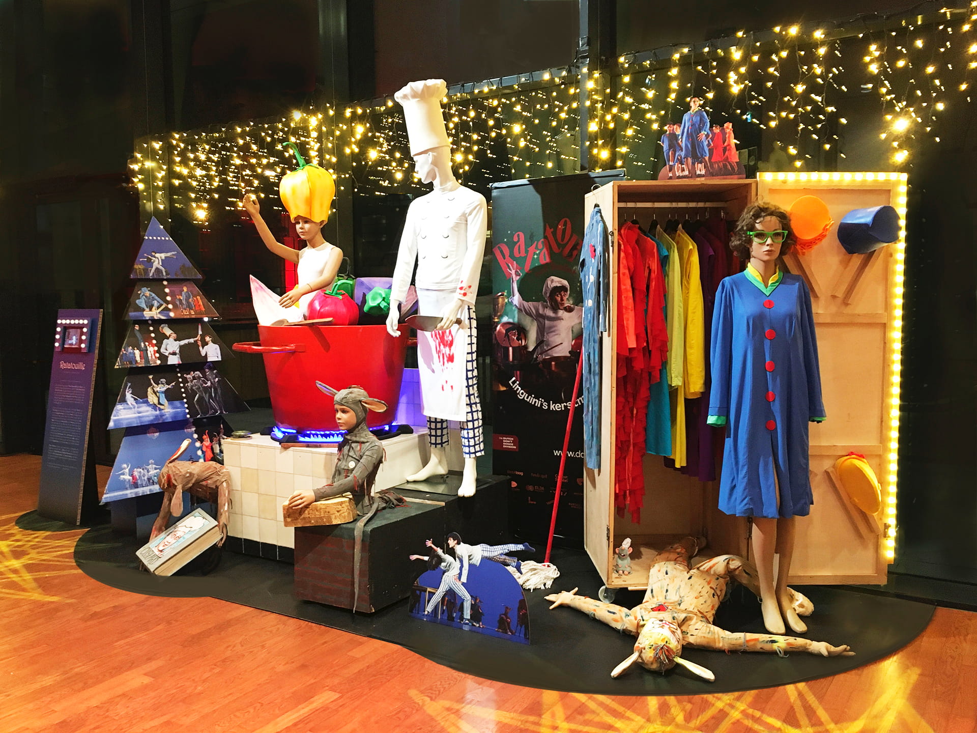 Op de vloer, in de bijschriften en tekstborden zijn speelse verwijzingen naar de huisstijl van de opdrachtgever verwerkt.